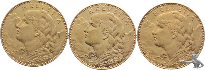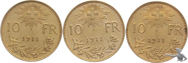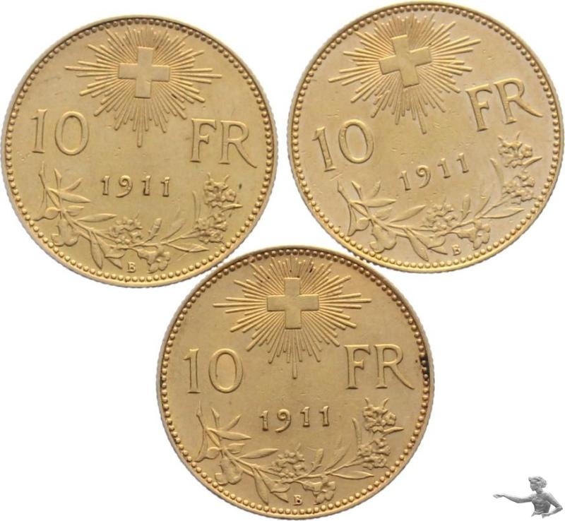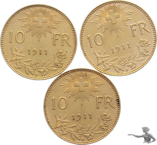 10 Franken 1911 B Gold Goldvreneli - Lot mit 3 Stück