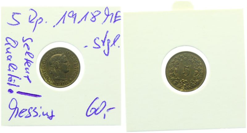 1918 Schweiz 5 Rappen Messing fast stempelglanz