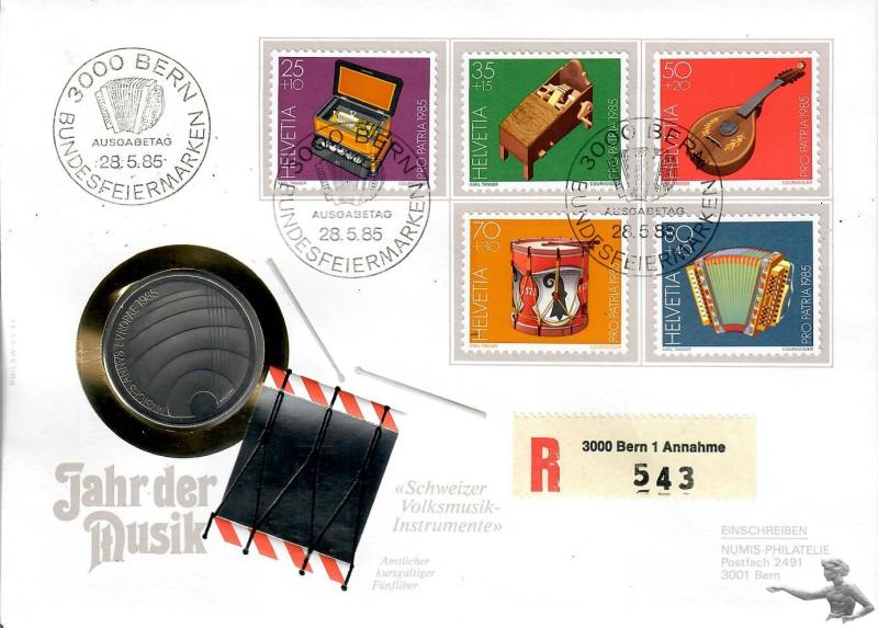 5 Franken 1985 Jahr der Musik, stempelglanz, Numisbrief