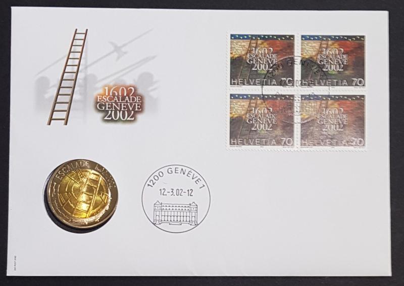 Numisbrief gestempelt 2012 mit 5 Franken 2002 Escalade Geneve Bimetallmünze